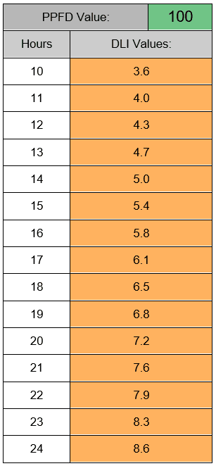 In our early research, as we showed above, we used a 14-hour photoperiod and an average PPFD of 50 µmol/m2s. We could thus calculate our DLI as: