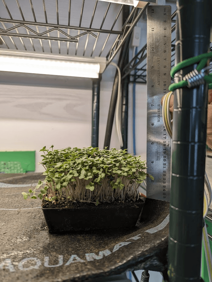 This shelf spacing accommodates both tall and short crops (see image below). If only short crops were being grown, we could move the shelf 2 to 3 inches (5 to 8 cm) closer to increase PPFD to 140 or 150 µmol/m2s.