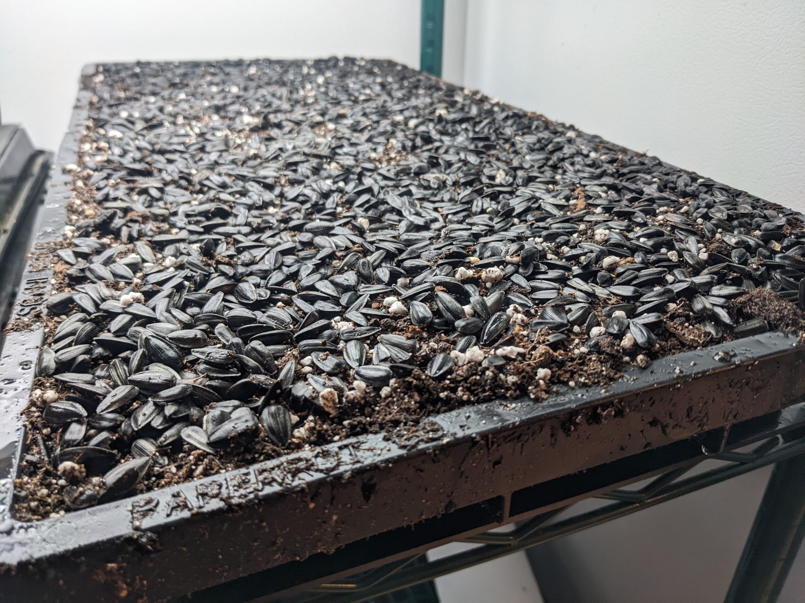 Crops can be removed from the germination stage when you can see they are pushing up the cover tray and trying to escape out the sides. A good rule of thumb is to uncover earlier than later to reduce the risk of crop disease due to limited air flow.