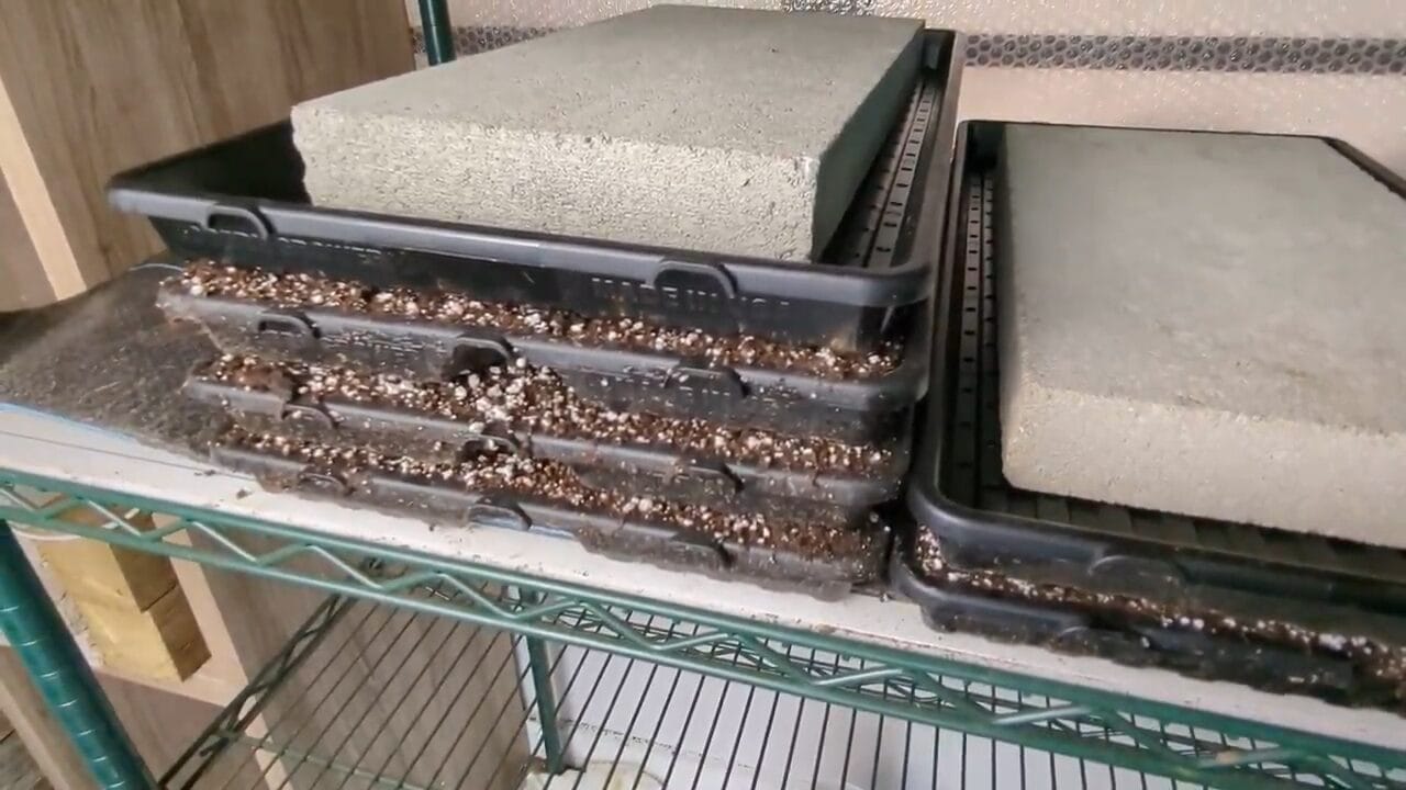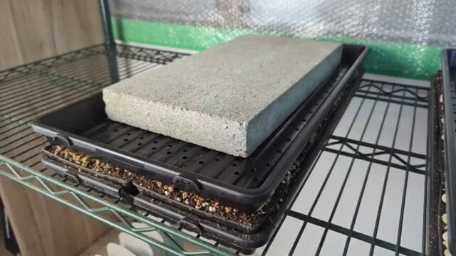 And heavy item placed on top of a cover tray to help ensure good contact between the cover tray and the sowed seed. A great option is an 8″ x 16″ paver which fits perfectly in a tray.